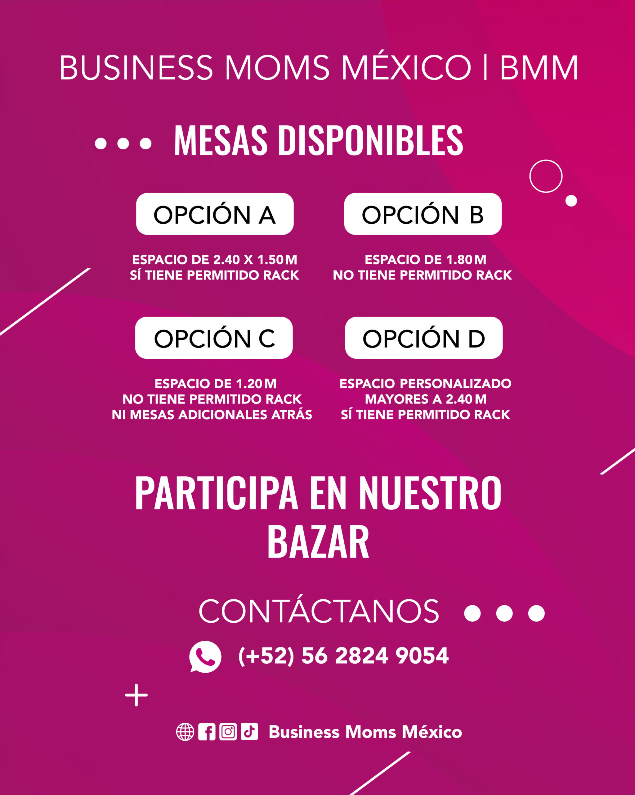 Los invitamos a estar pendientes de nuestras Redes Sociales, donde en nuestra publicidad se anuncia fecha y hora del Bazar BMM en turno.